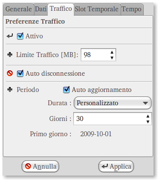Una volta installato lanciate NTM da applicazioni --> internet --> NTM. Dopo pochi secondi comparirà un icona simile a questa sotto: Cliccate sull'icona per aprire la finerstra principale del programma. Come potete vedere dall'immagine NTM visualizza il tempo e di dati utilizzati e quilli mancanti che potet modificare dalle impostazioni Quando installate NTM automaticamente viene inserito tra le applicazioni all'avvio, se volete disabilitarlo andate in sistema --> preferenze --> applicazioni avvio e deselezionate NTM.